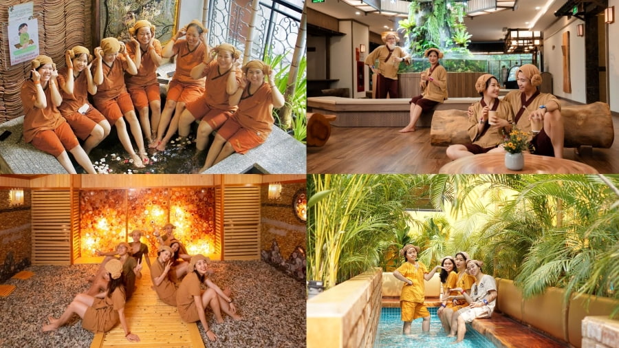 Sau khi làm sạch cơ thể, mọi người sẽ thay đồng phục cotton và bước vào khu xông hơi chung – nơi những phòng xông với mức nhiệt độ khác nhau mở ra trước mắt. Có phòng nóng được lát gạch đất sét, phòng đá muối Himalaya sáng hồng dịu nhẹ, phòng gỗ thông tỏa hương tự nhiên ấm áp, và cả những phòng lạnh giúp điều hòa thân nhiệt. Giữa các phòng là khu nghỉ ngơi với sàn gỗ hoặc sàn đá nóng, nơi mọi người có thể nằm dài, đọc sách, nói chuyện, thậm chí ngủ quên.